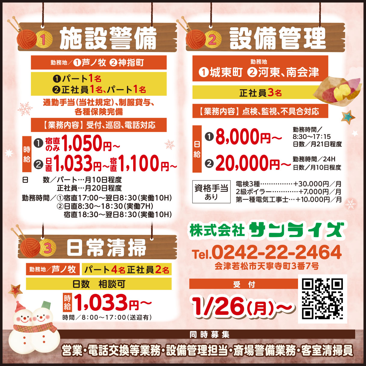 ①施設警備|①【宿直のみ】1,050円〜 ②【日直】1,033円〜宿直 1,100円~