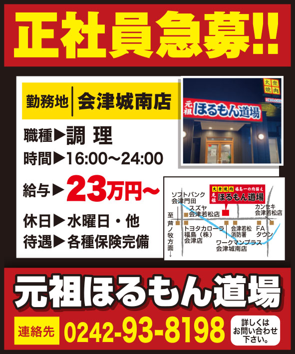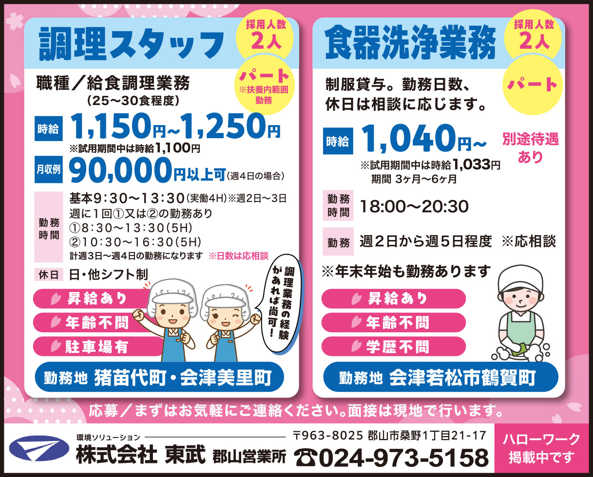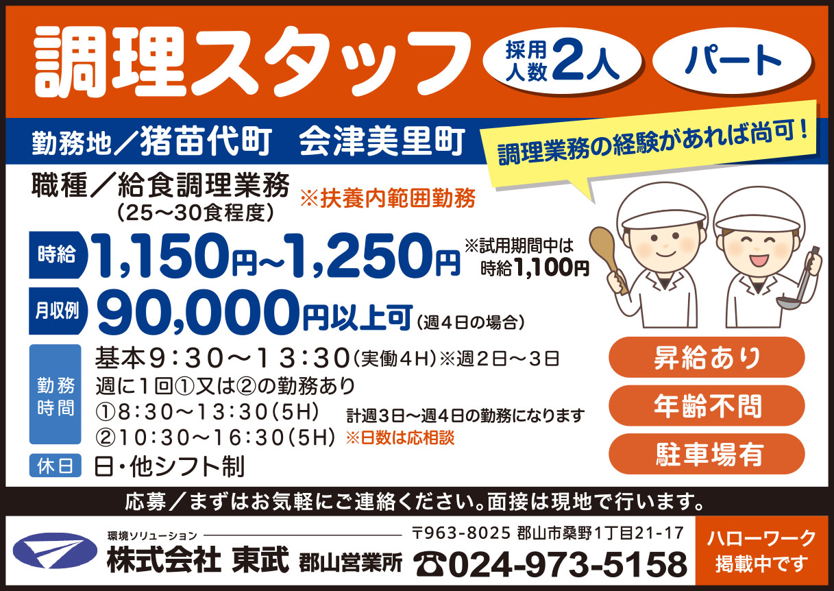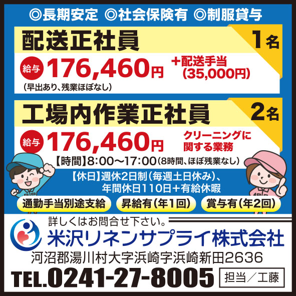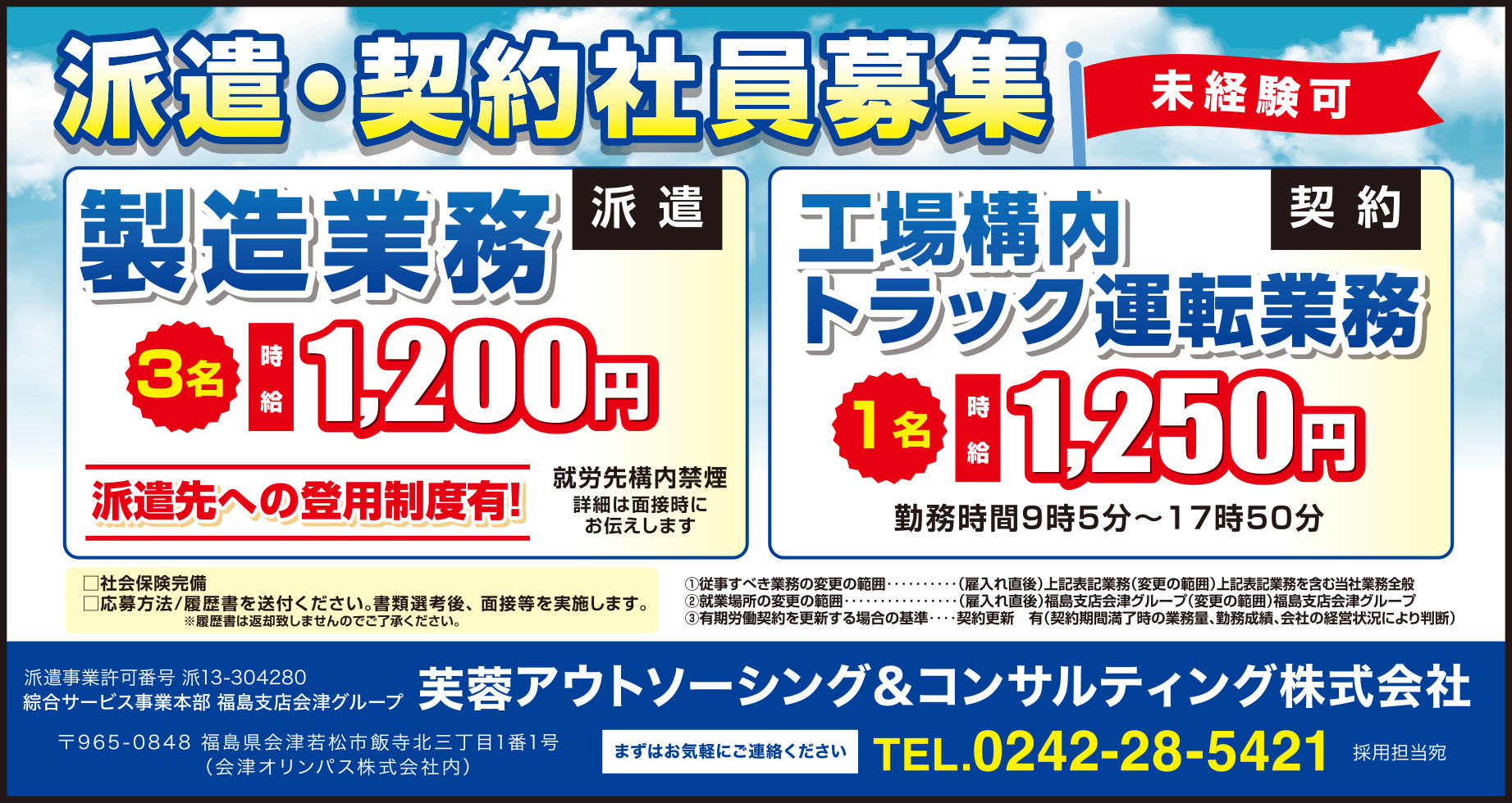 ①会津若松市扇町地内工場/8:00〜16:00(実働7h)・16:00〜24:00・24:00〜翌8:00