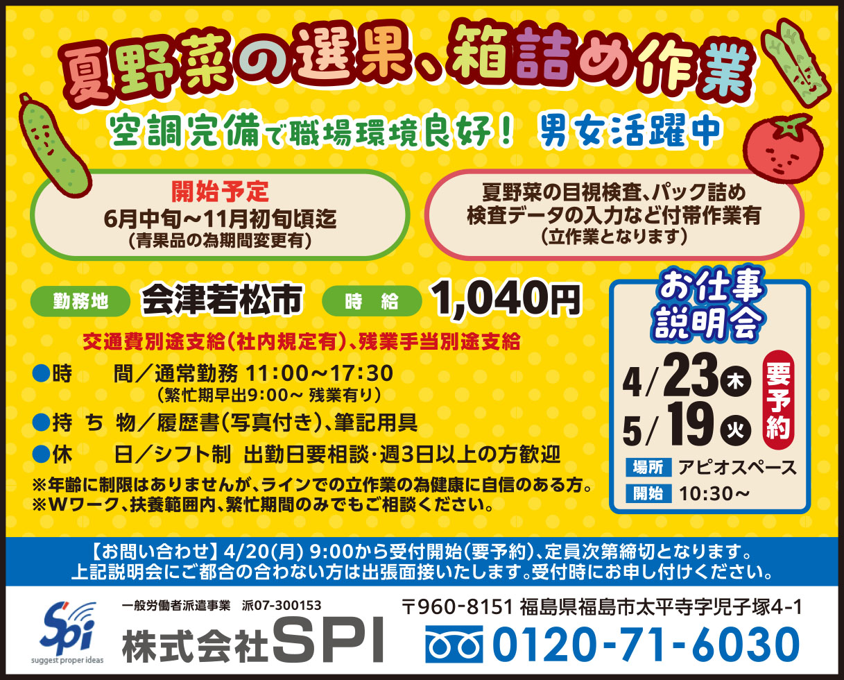 夏野菜の目視検査、パック詰め、検査データの入力など付帯作業有