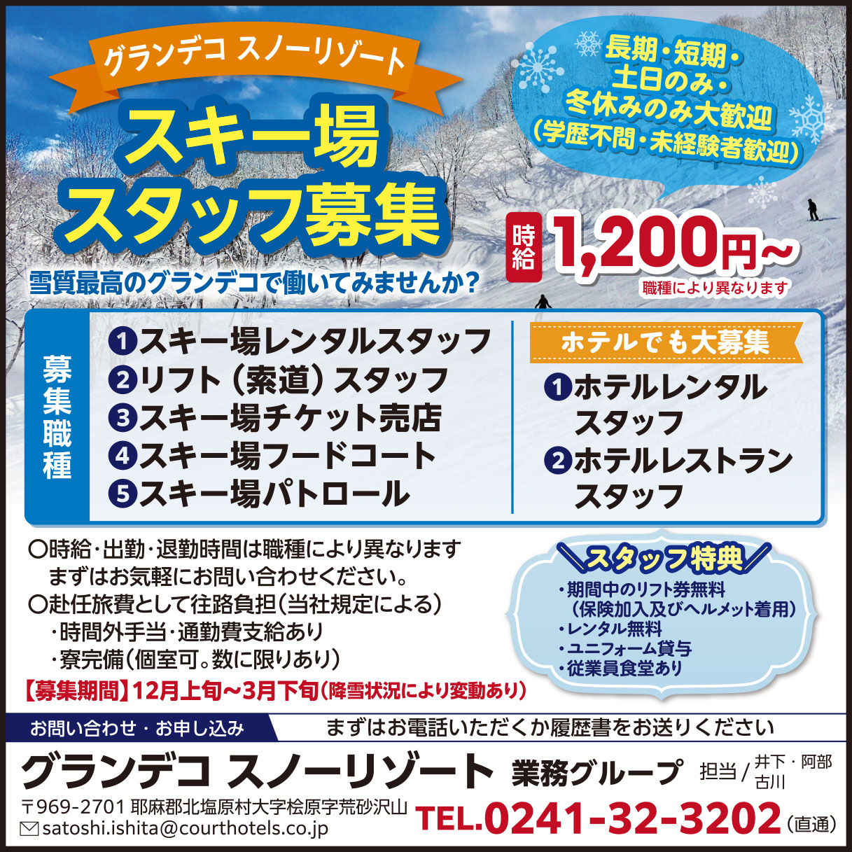 待 遇 | 赴任旅費として往路負担(当社規定による) ・時間外手当・通勤費支給あり ・寮完備(個室可。数に限りあり) スタッフ特典/ ・期間中のリフト券無料 (保険加入及びヘルメット着用) ・レンタル無料 ・ユニフォーム貸与 ・従業員食堂あり |