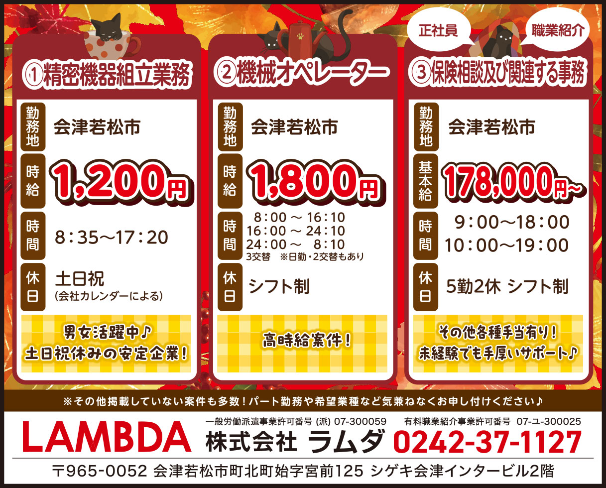 給 与 | ①精密機器組立業務/時給1,200円 ②機械オペレーター/時給1,800円~ ③保険相談及び関連する事務/基本給178,000円~ |
