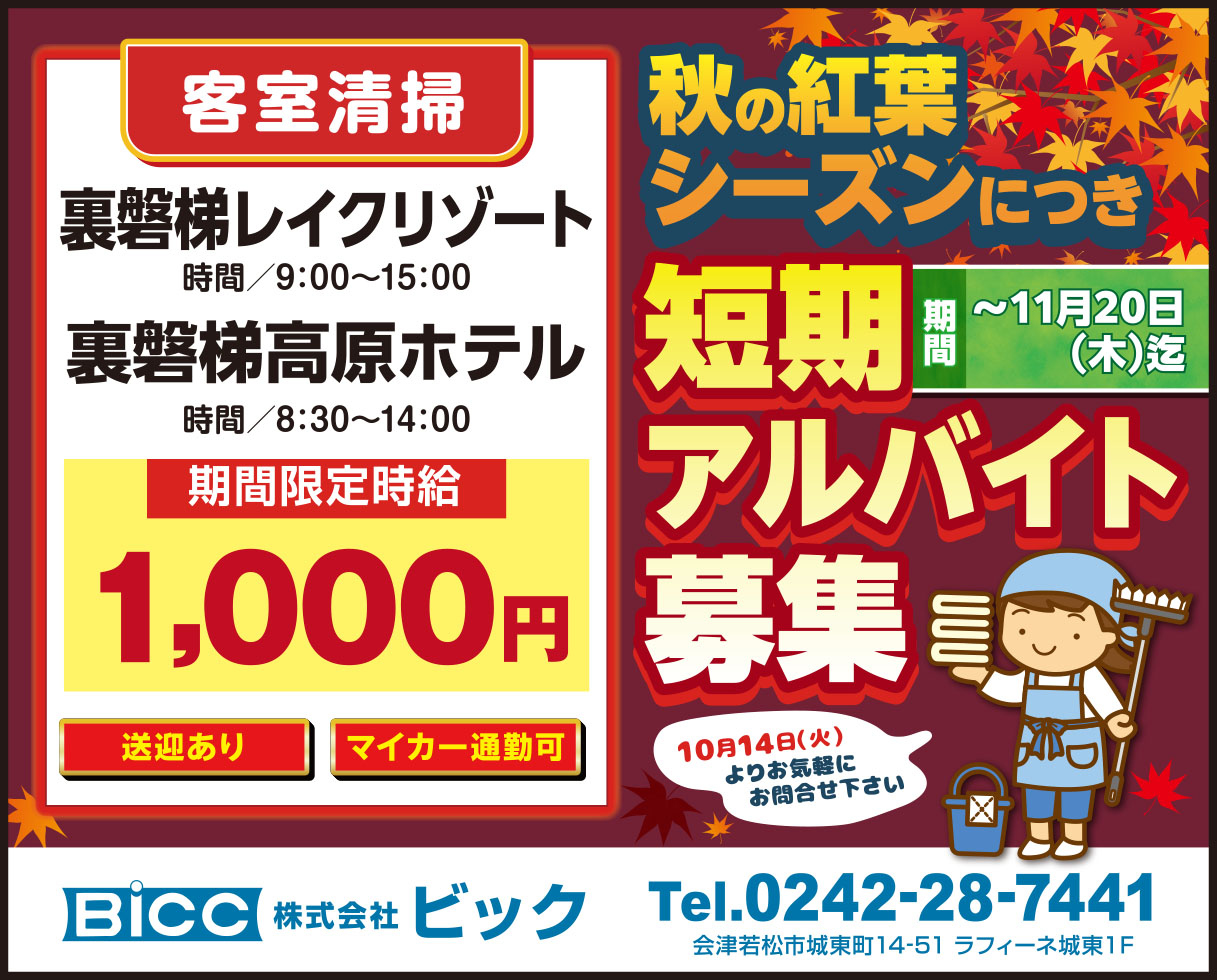 勤務時間 | 裏磐梯レイクリゾート/9:00~15:00 裏磐梯高原ホテル/8:30~14:00 |