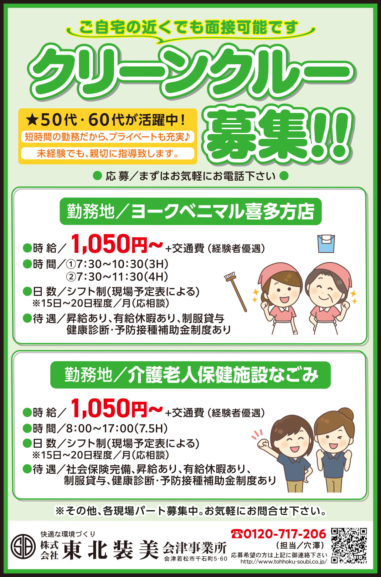 勤務時間 | ➀勤務地・ヨークベニマル喜多方店 7:30~10:30(3H) 8:00~11:00(3H) ➁勤務地・介護老人保健施設なごみ 8:00~17:00(7.5H) |