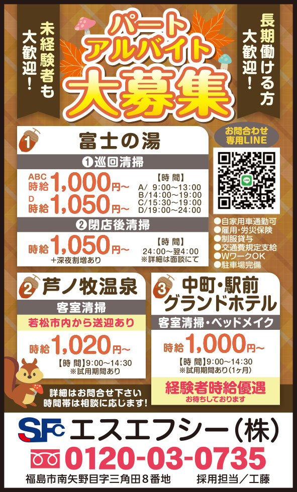 1. 富士の湯/①.巡回清掃 ②.閉店後清掃 ※詳細は面談にて