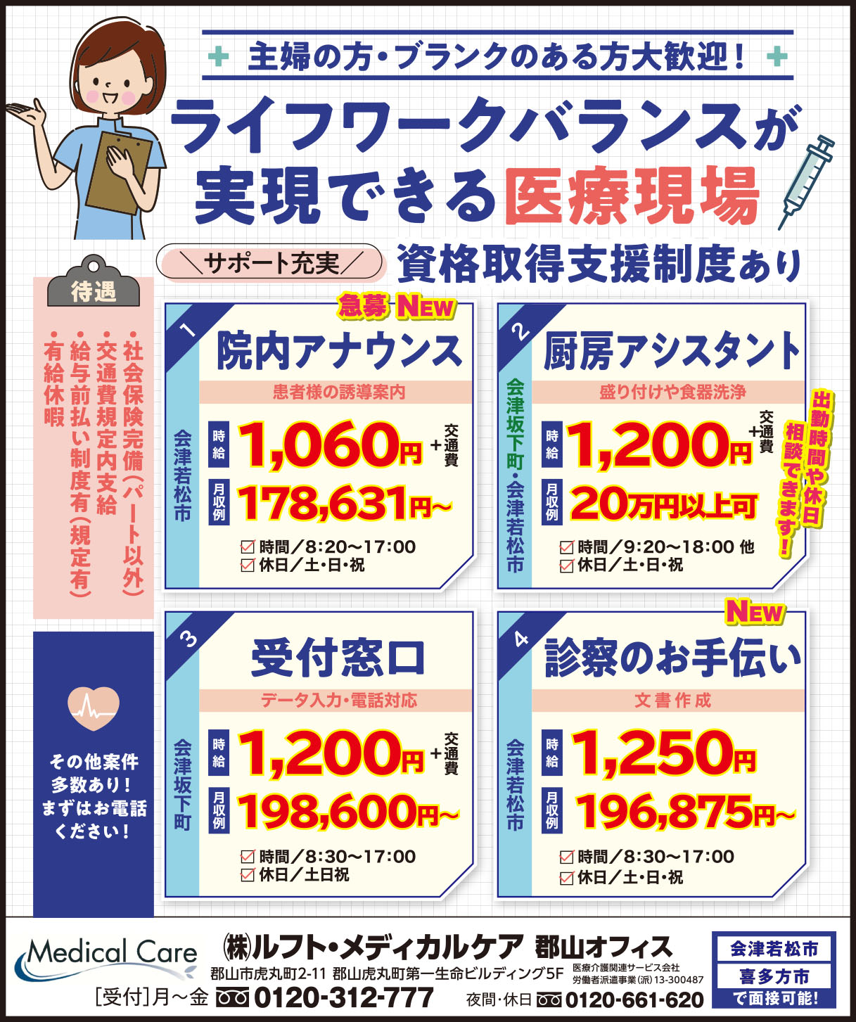 | 給 与 | ①院内アナウンス/時給1,060円+交通費 月収例178,631円~ ②厨房アシスタント/時給1,200円+交通費 月収例20万円以上可 ③受付窓口/時給1,200円+交通費 月収例198,600円~ ④診察のお手伝い/時給1,250円+交通費 月収例196,875円~ |