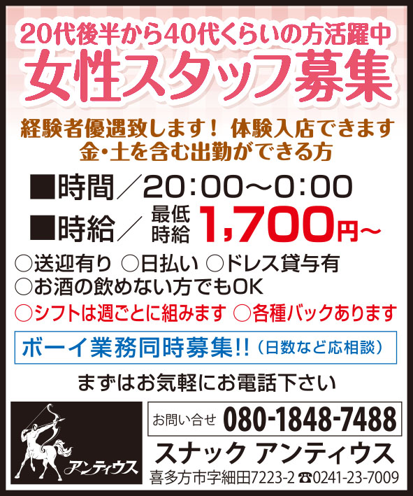 | 応募資格 | ○送迎有り ○日払い ○ドレス貸与有 ○お酒の飲めない方でもOK ○シフトは週ごとに組みます ○各種バックあります ボーイ業務同時募集!!(日数など応相談) |