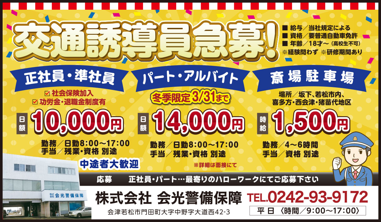 | 給 与 | 1.正社員・準社員/日給10,000円〜 2.パート・アルバイト(週2日程)/日給14,000円〜 冬季限定3/31まで 3.斎場駐車場/時給1,500円〜 ※当社規定による |
