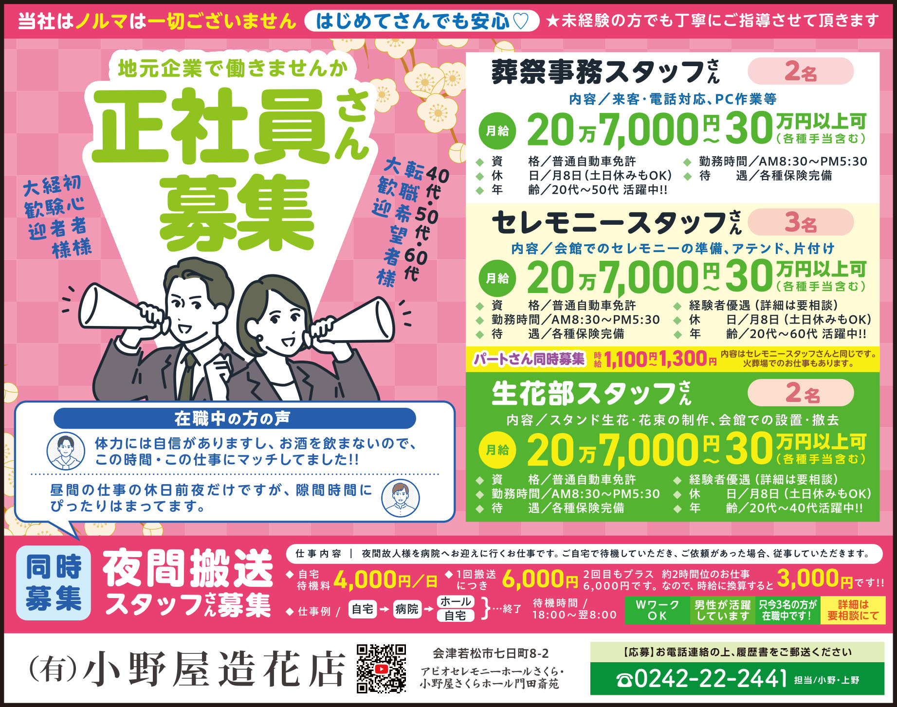 | 応募資格 | 資格 普通自動車免許 ①葬祭事務スタッフさん/20代~50代 活躍中!! ②セレモニースタッフさん/20代~60代 活躍中!! ③生花部スタッフさん/20代~40代活躍中!! |