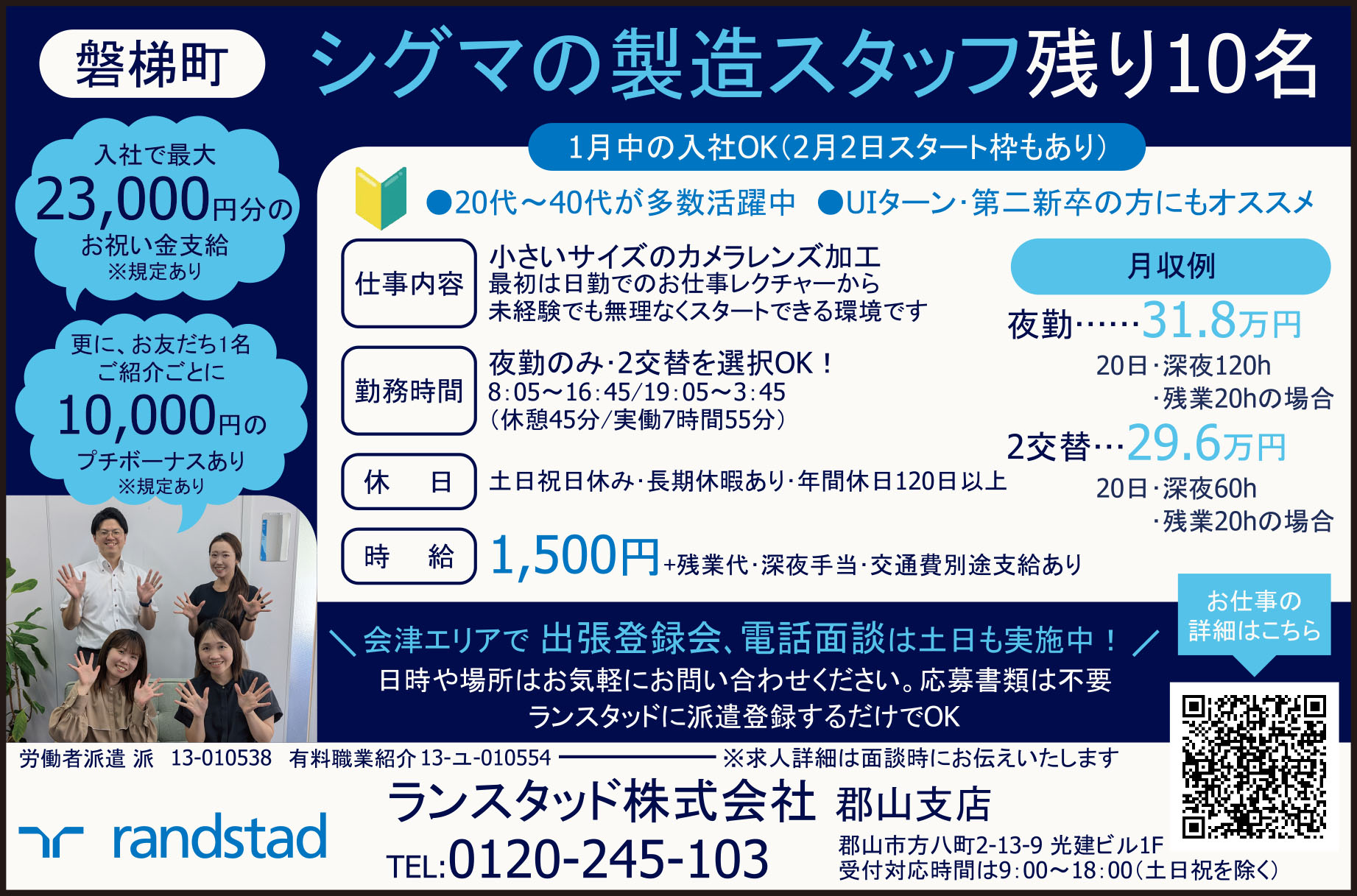 | 応募方法 | 会津エリアで 出張登録会、電話面談は土日も実施中! 日時や場所はお気軽にお問い合わせください。応募書類は不要 ランスタッドに派遣登録するだけでOK ■ WEB応募 24時間いつでも受付中! |