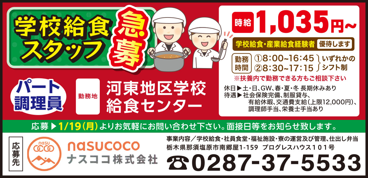 待 遇 社会保険完備、制服貸与、有給休暇、交通費支給(上限12,000円)、調理師手当、栄養士手当あり