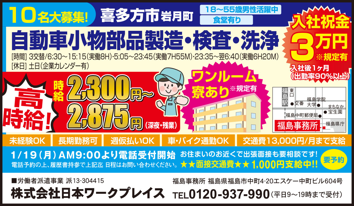 待 遇 週仮払いOK、車・バイク通勤OK、交通費13,000円/月まで支給