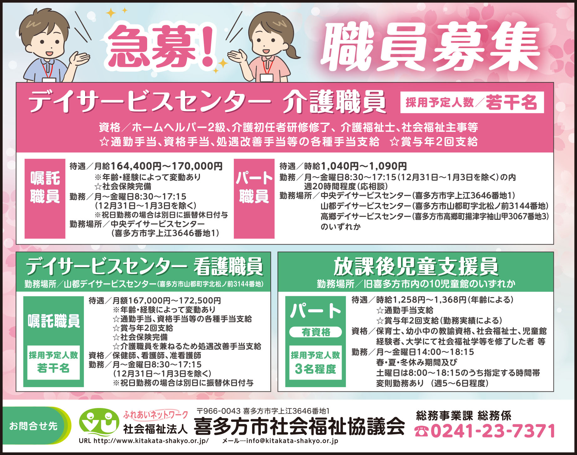 | 待 遇 | ①デイサービスセンター 介護職員/ ホームヘルパー2級、介護初任者研修修了、 介護福祉士、社会福祉主事等☆通勤手当、資格手当、処遇改善手当等の各種手当支給 ☆ 賞与年2回支給 嘱託職員/社会保険完備 ②デイサービスセンター 看護職員 嘱託職員/☆通勤手当、資格手当等の各種手当支給、☆賞与年2回支給、☆社会保険完備、☆介護職員を兼ねるため処遇改善手当支給 ③放課後児童支援員 パート/☆通勤手当支給、☆賞与年2回支給(勤務実績による) |