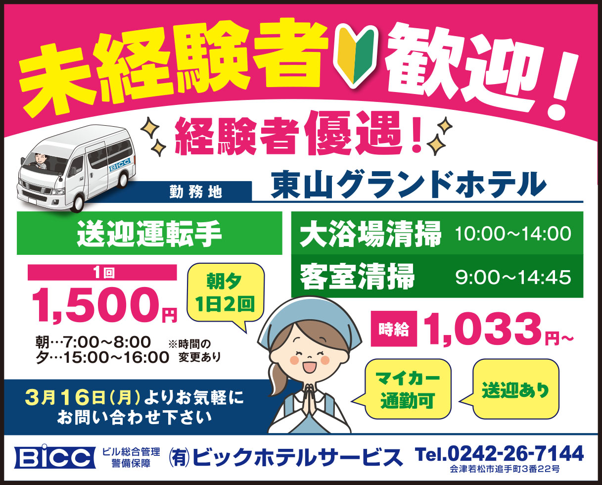 | 給 与 | 送迎運転手/1回 1,500円 大浴場清掃 | 客室清掃/時給 1,033円~ |