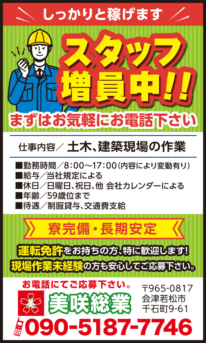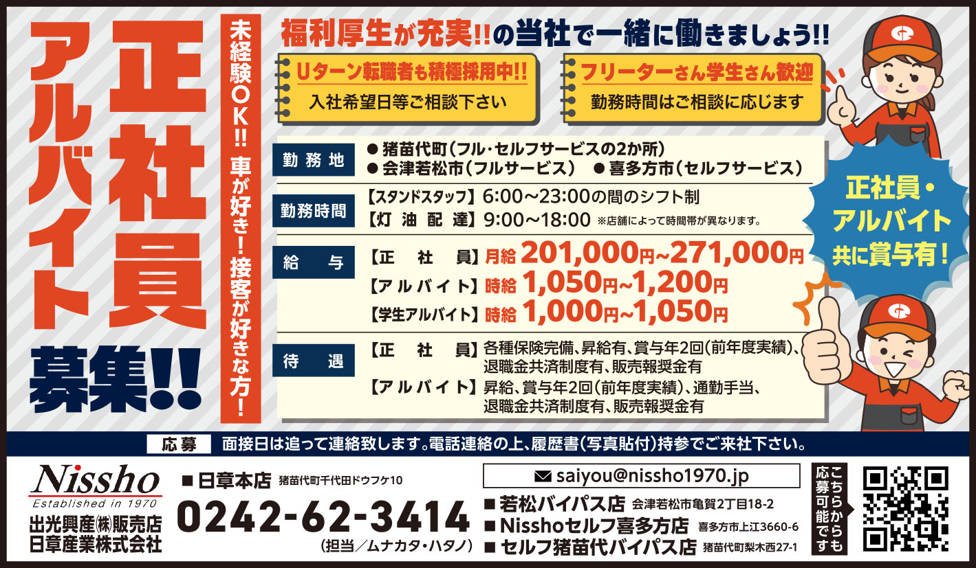 | 勤務地 | 会津若松市 大戸町/芦ノ牧 南会津町 |