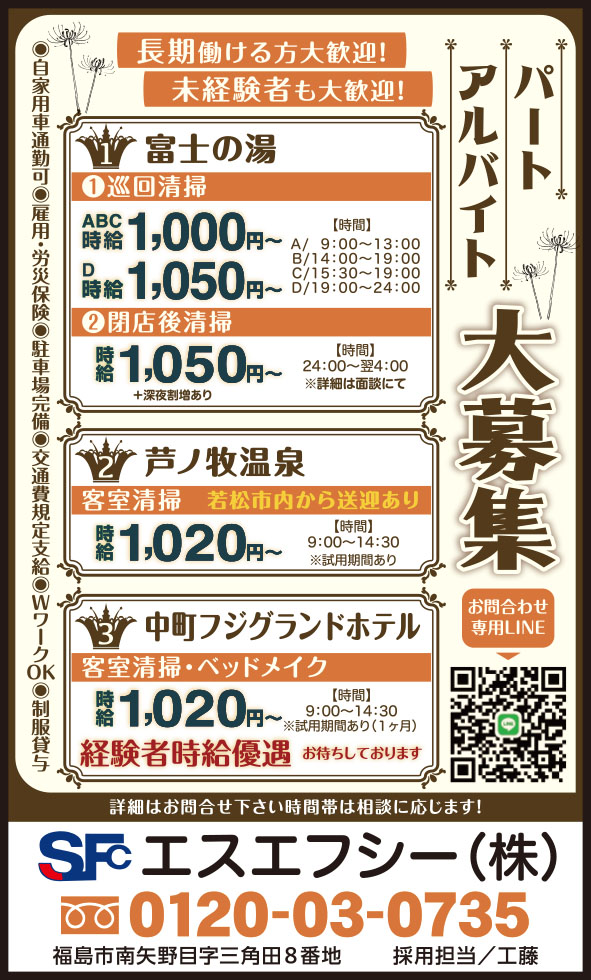 | 給与 | 1. 富士の湯/①ABC.時給 1,000円~ D.時給 1,050円~ ②時給 1,050円~+深夜割増あり 2. 芦ノ牧温泉 客室清掃/時給 1,020円~ 3. 中町フジグランドホテル/時給 1,020円~ |