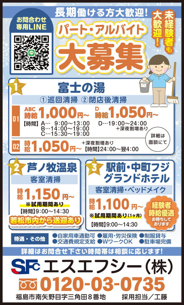 仕事内容 1. 富士の湯/①.巡回清掃 ②.閉店後清掃 ※詳細は面談にて