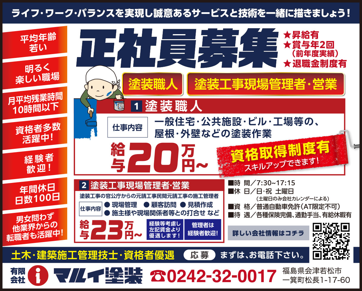 | 給与 | ①塗装職人/給与20万円~ ②塗装工事現場管理者・営業 / 給与23万円~ 経験等考慮し 左記賃金より優遇します! |