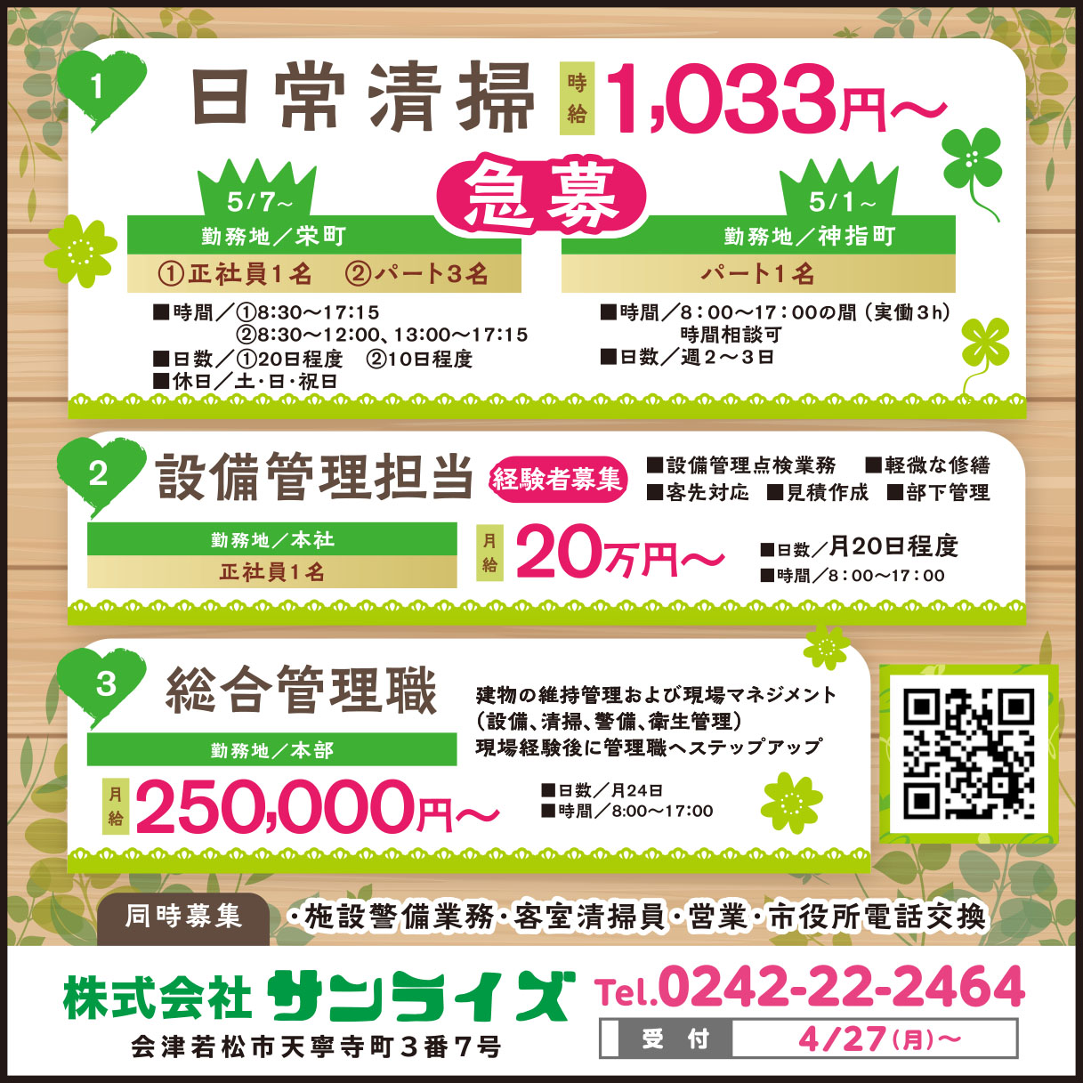 | 勤務時間 | ①日常清掃/常清掃/ 【勤務地】栄町 5/7~/正社員 ①8:30~17:15 パート ②8:30~12:00、13:00~17:15 日数/①20日程度 ②10日程度 【勤務地】神指町 5/1~/8:00~17:00の間(実働3h)時間相談可 日数/週2~3日 ②設備管理担当/8:00~17:00 日数/月20日程度 ③総合管理職/8:00~17:00 日数/月24日 |