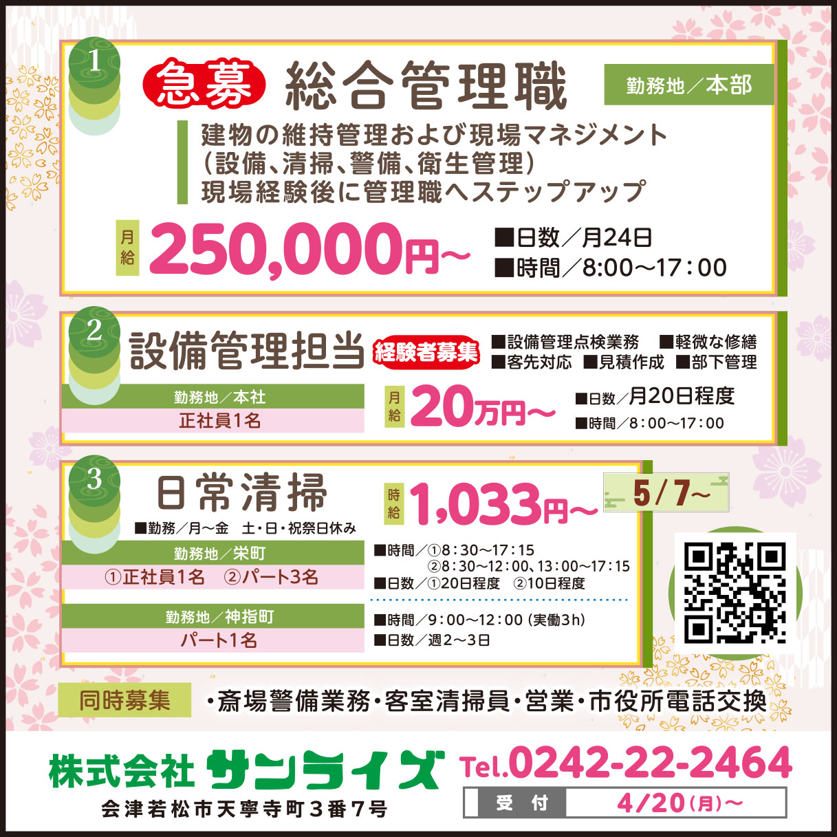 ①総合管理職/月給 250,000円~