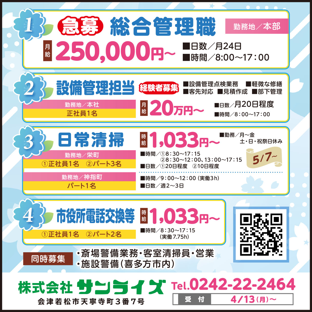 | 勤務地 | 会津若松市 喜多方市 会津坂下町 会津美里町 磐梯町 猪苗代町 |