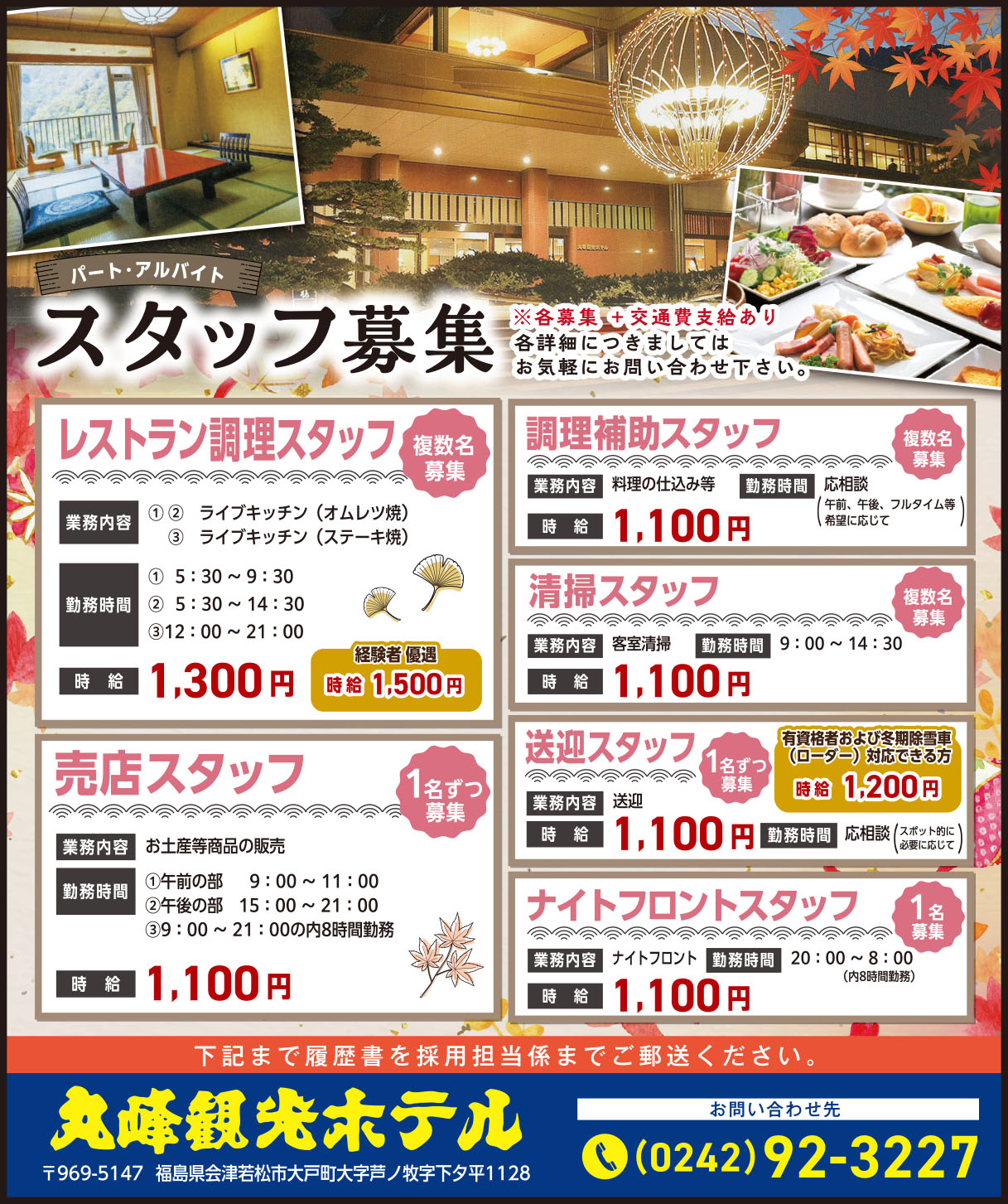 | 給与 | ①レストラン調理スタッフ-時給1,300円 ②売店スタッフ-時給1,100円 ③調理補助スタッフ-時給1,100円 ④清掃スタッフ-時給1,100円 ⑤送迎スタッフ-時給1,100円 ⑥ナイトフロントスタッフ-時給1,100円 |