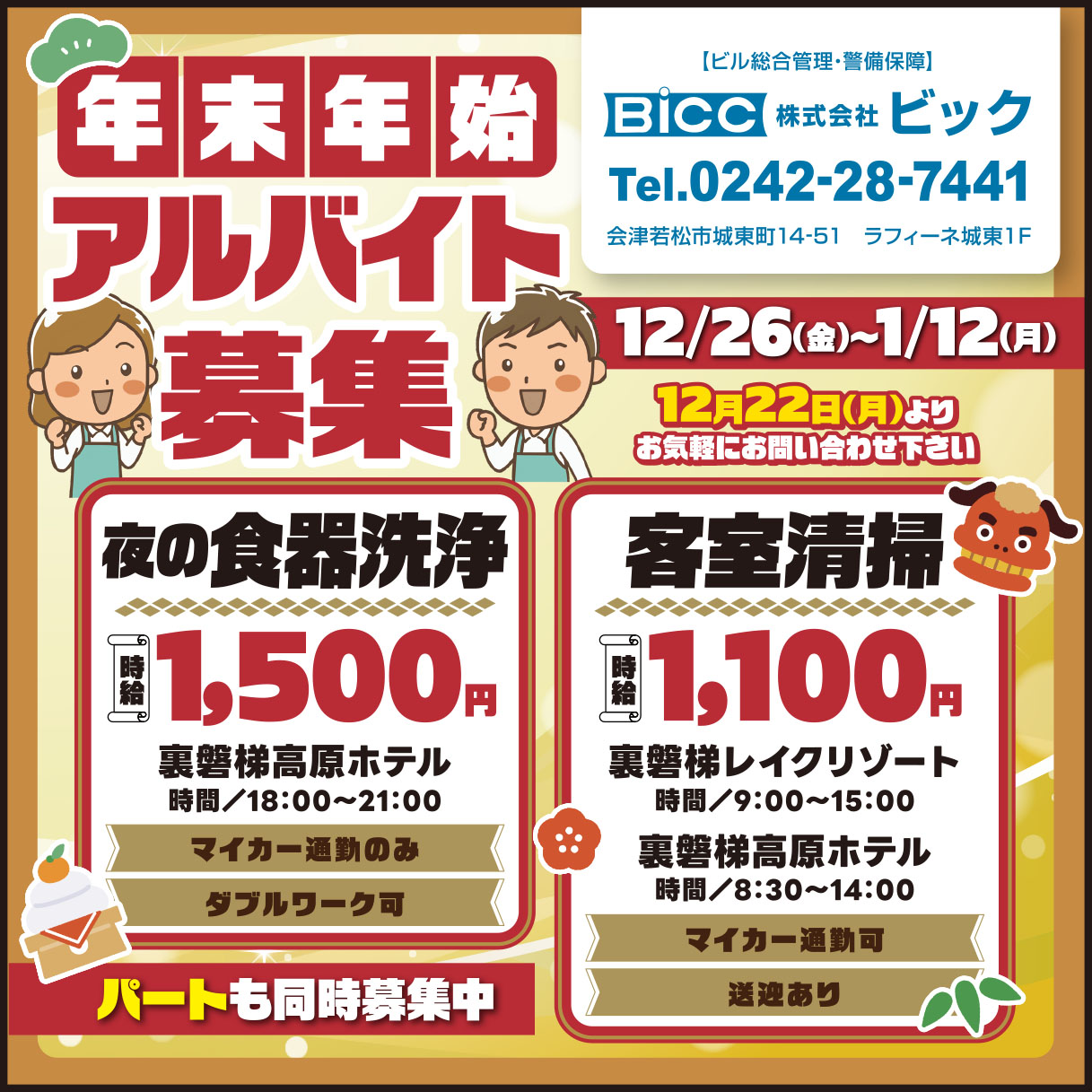 | 勤務時間 | ①夜の食器洗浄/18:00~21:00 ②客室清掃/ 裏磐梯レイクリゾート/9:00~15:00 裏磐梯高原ホテル/8:30~14:00 |