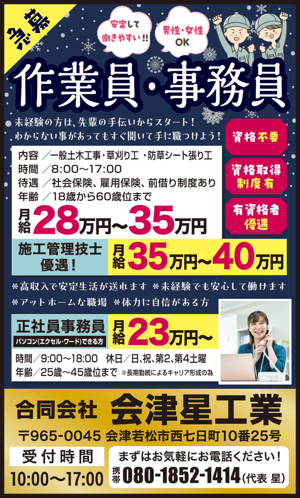 | 勤務地 | 会津若松市 大戸町/芦ノ牧 南会津町 |