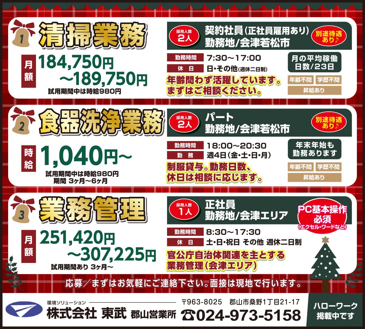 | 給与 | ①清掃業務/月額 184,750円~189,750円 試用期間中は時給980円 ②食器洗浄業務/時給 1,040円~ 試用期間中は時給980円 期間 3ヶ月~6ヶ月 ③業務管理/月額 251,420円~307,225円 試用期間あり3ヶ月〜 |