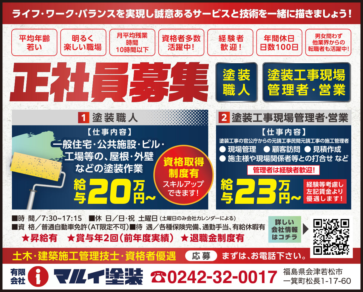 | 給与 | ①塗装職人/給与20万円~ ②塗装工事現場管理者・営業 / 給与23万円~ 経験等考慮し 左記賃金より優遇します! |