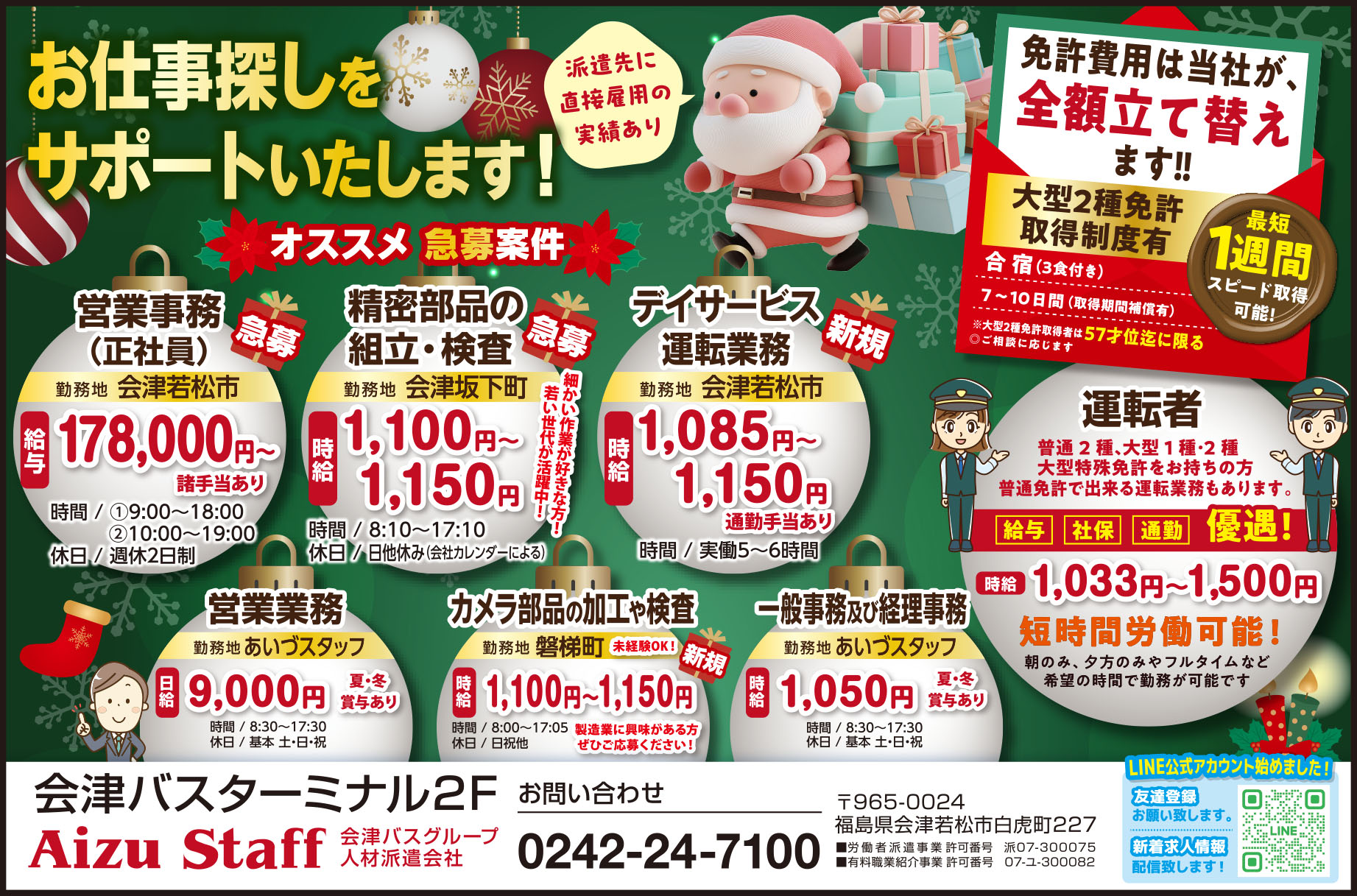 | 給与 | ・営業事務(正社員)/給与178,000円~諸手当あり ・精密部品の組立・検査/時給1,100円~1,150円 ・デイサービス運転業務/時給1,085円~1,150円 通勤手当あり ・営業事務(あいづスタッフ)/日給9,000円 夏・冬賞与あり ・カメラ部品の加工や検査/時給1,100円~1,150円 ・一般事務及び経理事務/時給1,050円 ・運転者/時給1,033円~1,500円 |