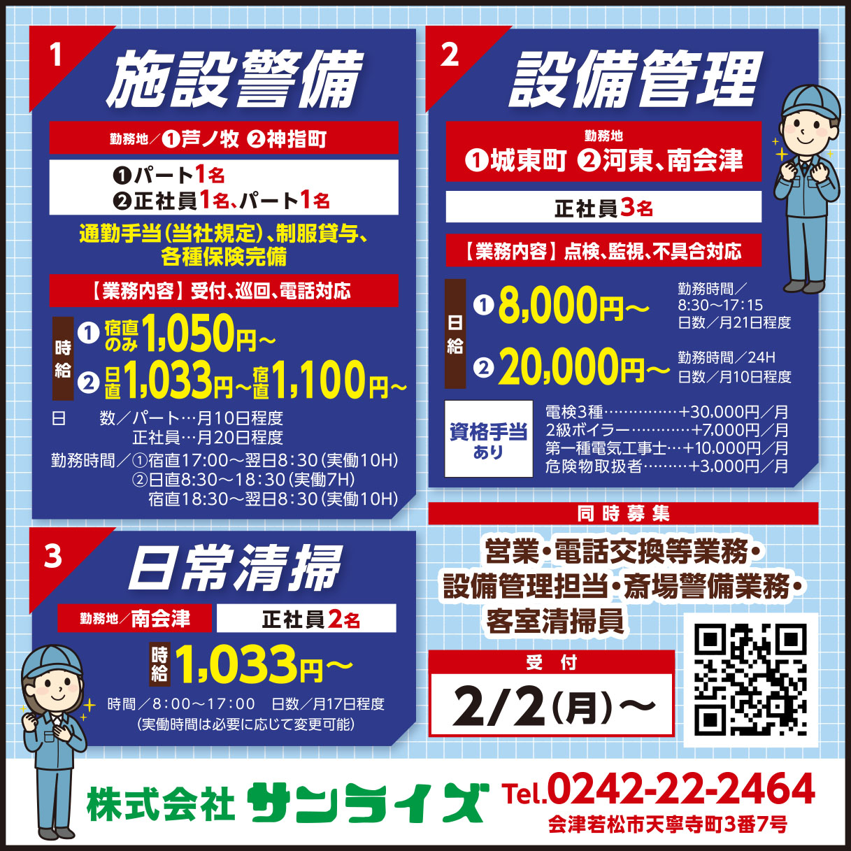 ②設備管理|①日給 8,000円〜 ②日給 20,000円〜
