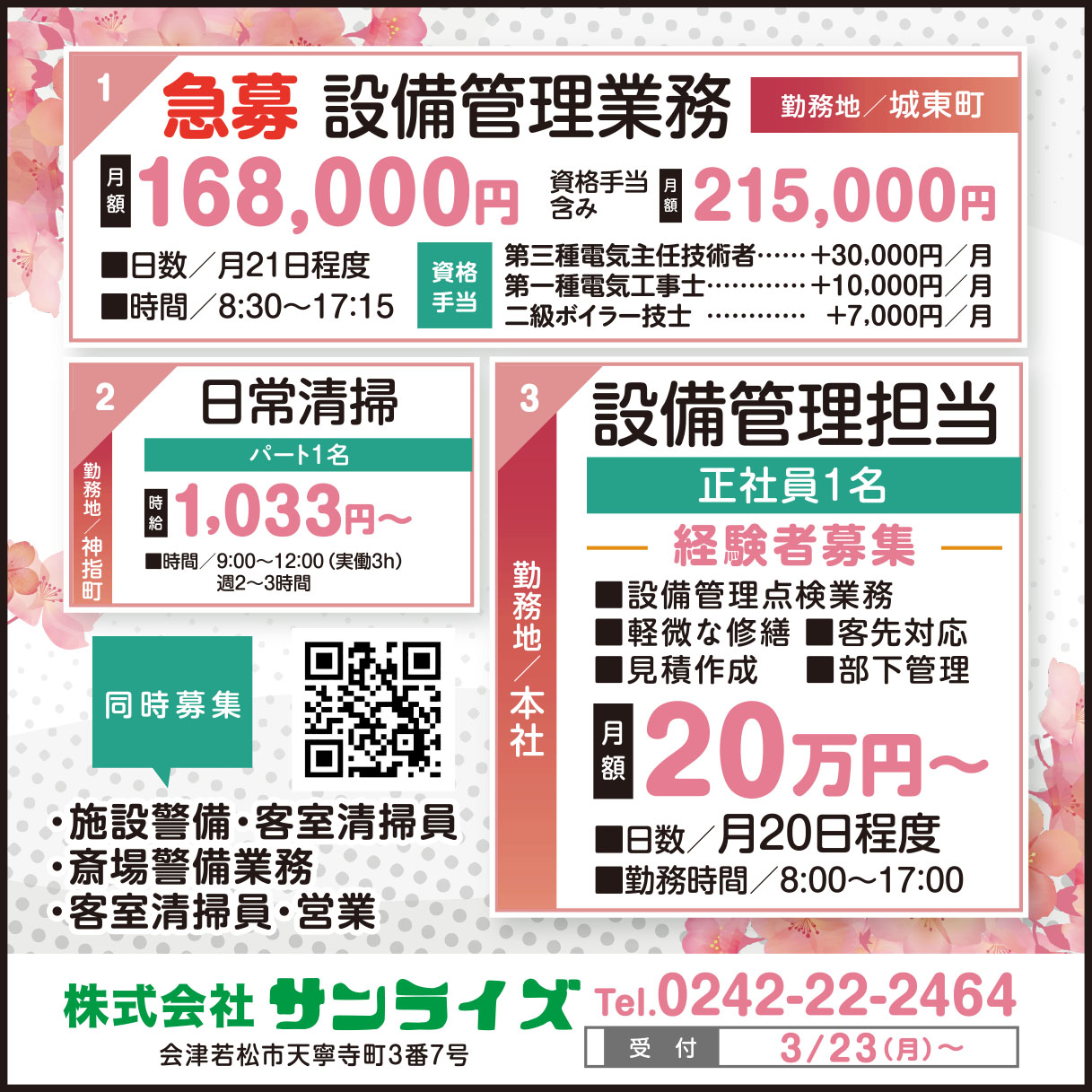 ①設備管理業務/月額 168,000円 資格手当含み 月額 215,000円
