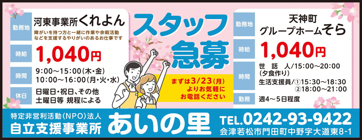 生活支援員 ①15:30~18:30 ②18:00~21:00 |