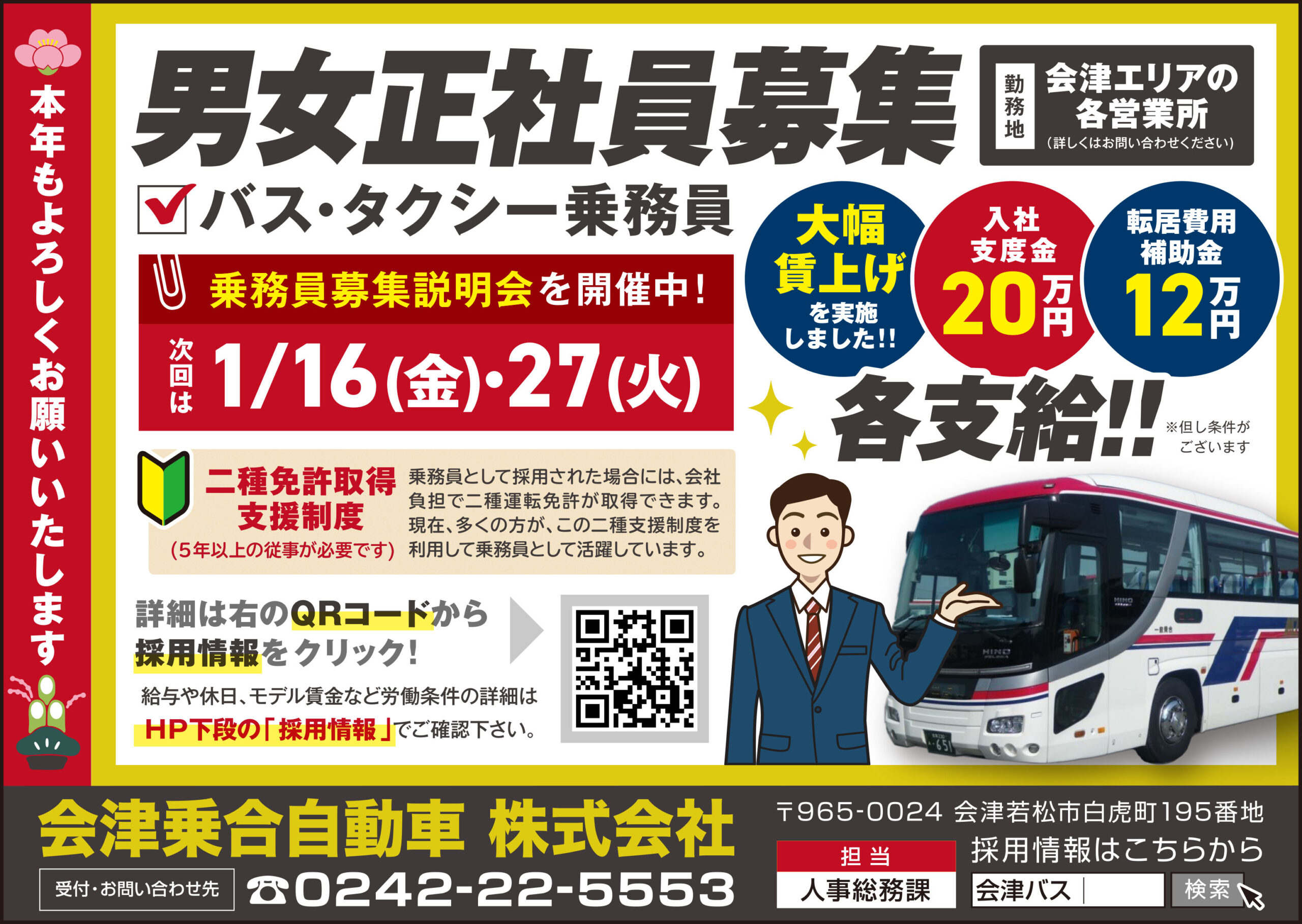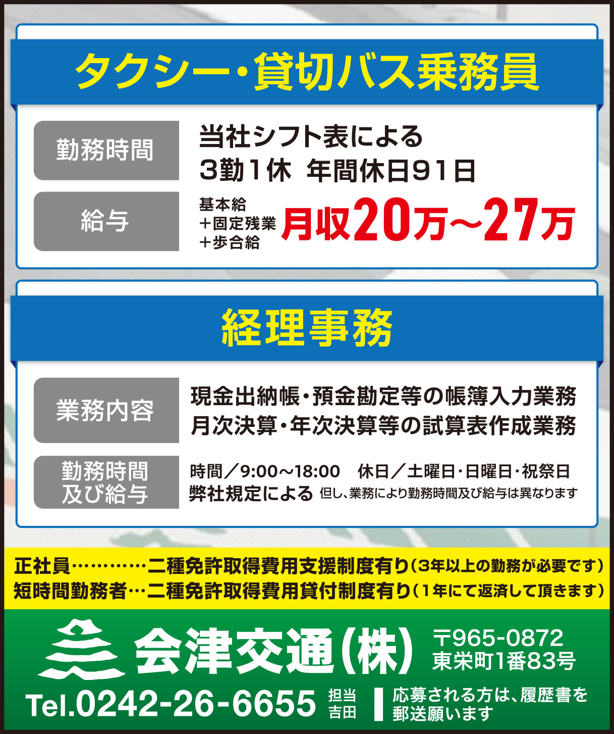 タクシー・貸切バス乗務員 /基本給+固定残業+歩合給 月収20万~27万