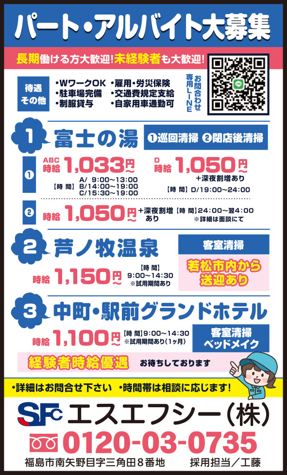 1. 富士の湯/①ABC.時給 1,033円~ D.時給 1,050円~+深夜割増あり