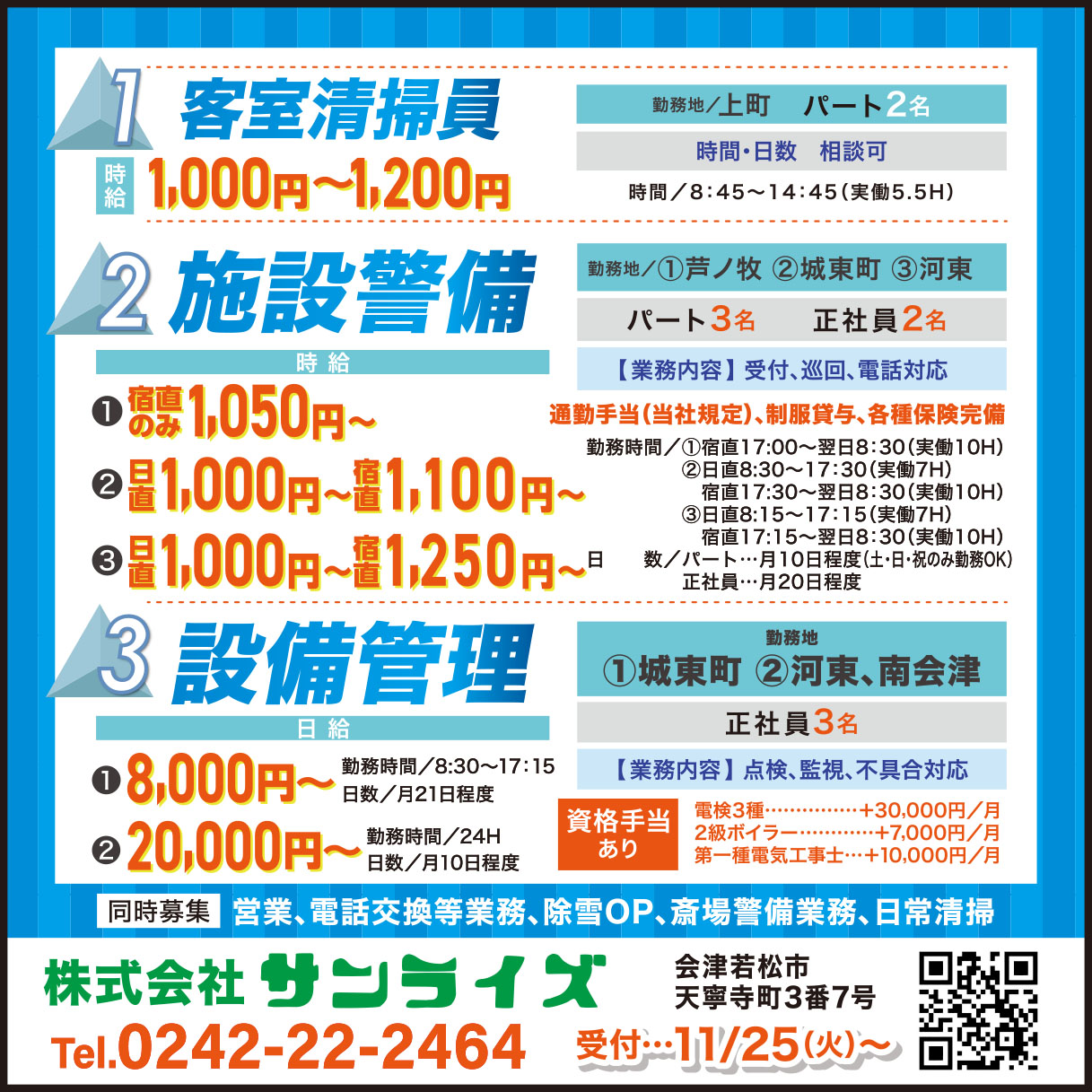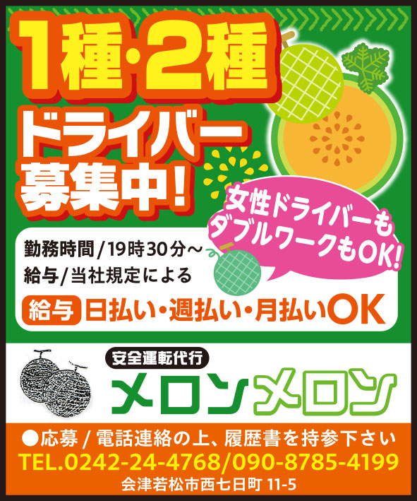 | 勤務時間 | 会津白虎町店/①6:00~09:00 ② 8:00~13:00 ③13:00~18:00 ④21:00~24:00(25) ⑤ 0:00~9:00(6) ⑥フルタイム(経験有無 規定あり 各種保険) ※22時以降別途深夜手当有 会津坂下古町店/① 6:00~09:00② 8:00~14:00 4h~5h |