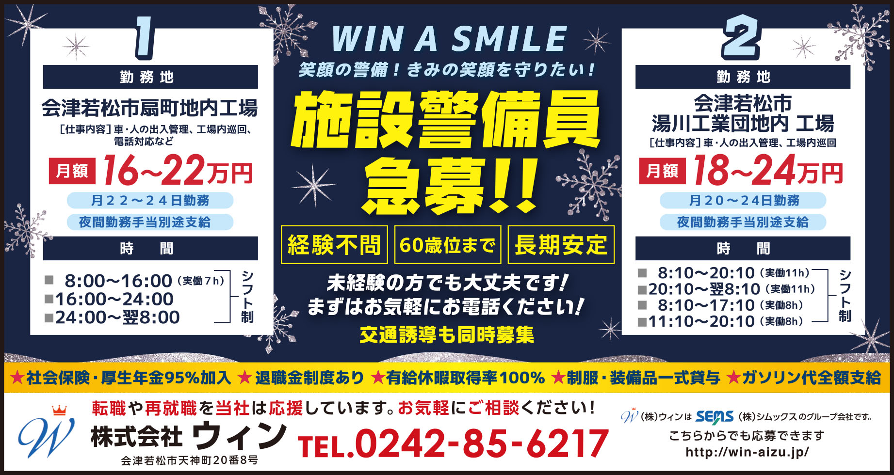 | 給与 | ①会津若松市扇町地内工場/月額16~22万円 ②湯川工業団地内 工場/月額18〜24万円 |