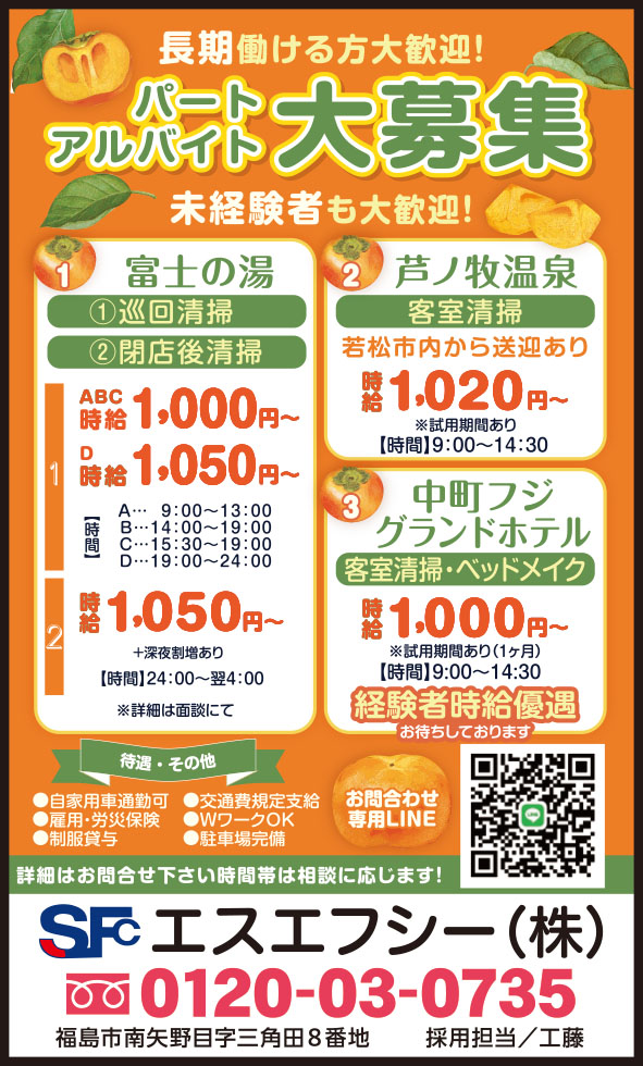 | 給与 | 1. 富士の湯/①ABC.時給 1,000円~ D.時給 1,050円~ ②時給 1,050円~+深夜割増あり 2. 芦ノ牧温泉 客室清掃/時給 1,020円~ 3. 中町フジグランドホテル/時給 1,000円~ |