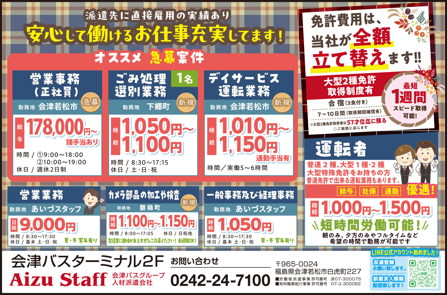 | 給与 | ・営業事務(正社員)/給与178,000円~諸手当あり ・ごみ処理選別業務/時給1,050円~1,100円 ・デイサービス運転業務/時給1,010円~1,150円 通勤手当有 ・営業事務(あいづスタッフ)/日給9,000円 ・カメラ部品の加工や検査/時給1,100円~1,150円 ・一般事務及び経理事務/時給1,050円 ・運転者/時給1,000円~1,500円 |