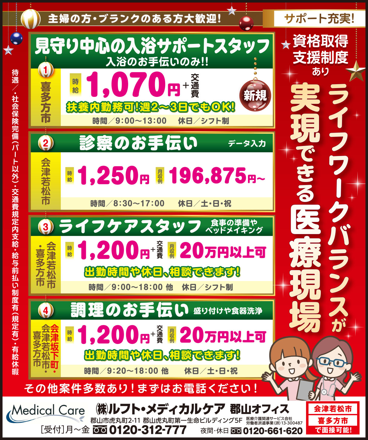 ①見守り中心の入浴サポートスタッフ/入浴のお手伝いのみ!! ②診察のお手伝い/データ入力 ③ライフケアスタッフ/食事の準備やベッドメイキング ④調理のお手伝い/盛り付けや食器洗浄 |