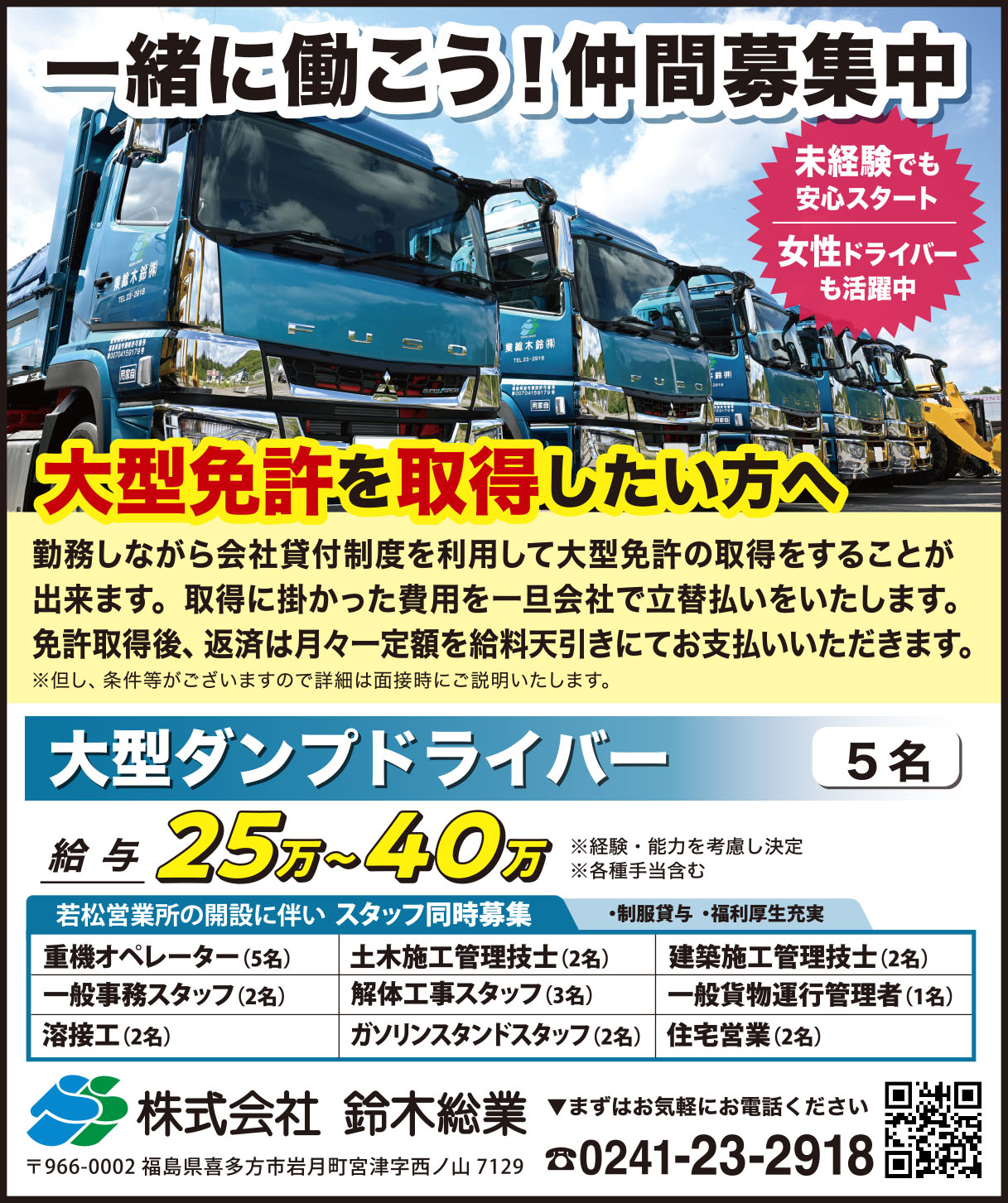 | 給与 | 当社規定による 大型ダンプドライバー/25万~40万 ※経験・能力を考慮し決定 |