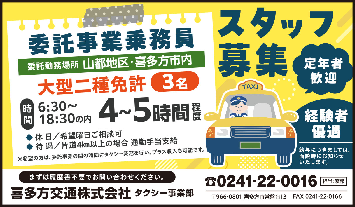 | 勤務時間 | 委託事業乗務員/6:30~18:30の内 4~5時間程度 |