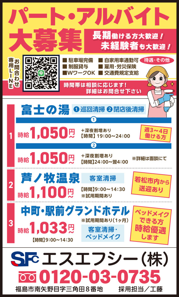 | 給与 | 1. 富士の湯/①時給 1,050円~+深夜割増あり ②時給 1,050円~+深夜割増あり 2. 芦ノ牧温泉 客室清掃/時給 1,100円~ 3. 中町・駅前グランドホテル/時給 1,033円~ |
