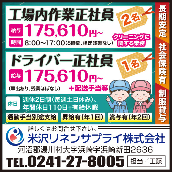 | 給与 | ①会津若松市扇町地内工場/月額16〜22万円 ②湯川工業団地内 工場/月額18〜24万円 |
